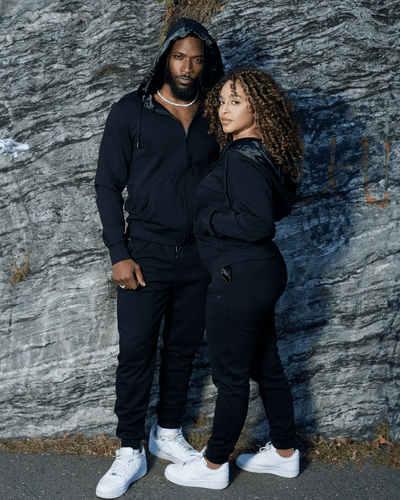 Hoodie DetailsLightweight zip up hoodieMade with 100% Cotton French TerryHoodie color is black, satin color is blackHood is double-layered with high-grade satinKIN logo is embroidered on left sleeveOur motto "Keep It Naturally" is embroidered on edge of hood. Unisex and fitted Jogger DetailsLightweight black joggersMade with 100% Cotton French TerryFront pockets are satin lined with black satinKIN logo is embroidered below the left pocketIncludes back pocketUnisex and fitted