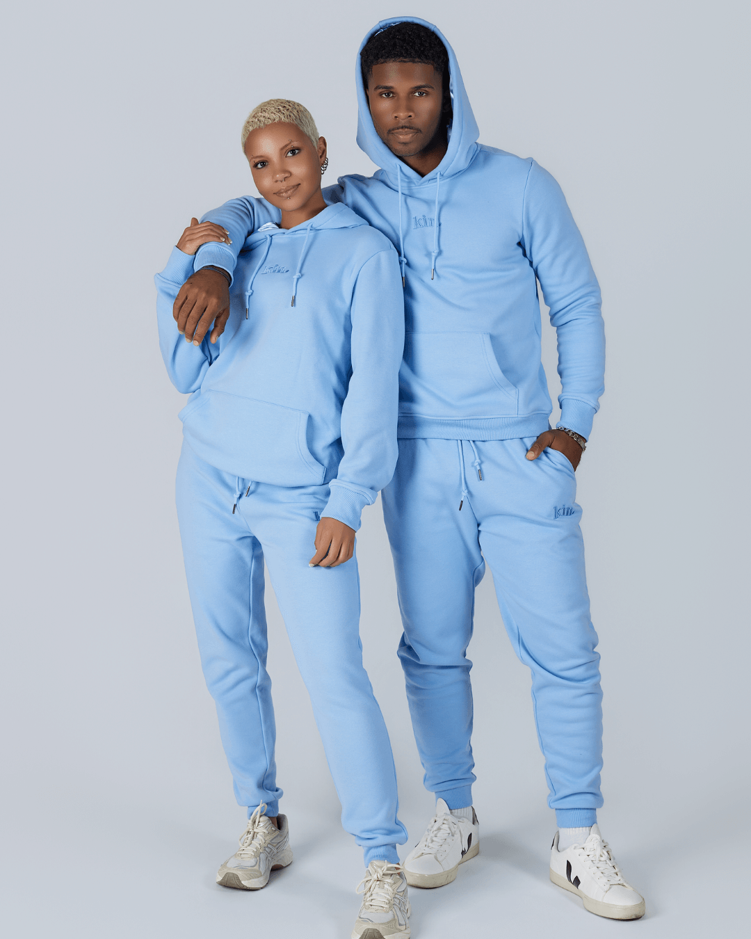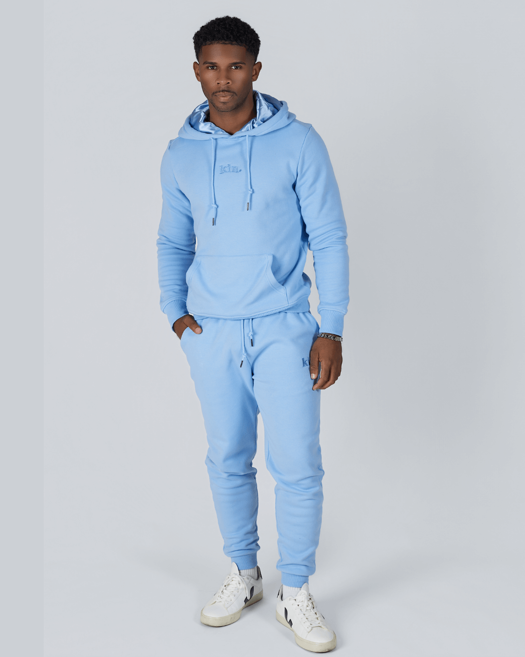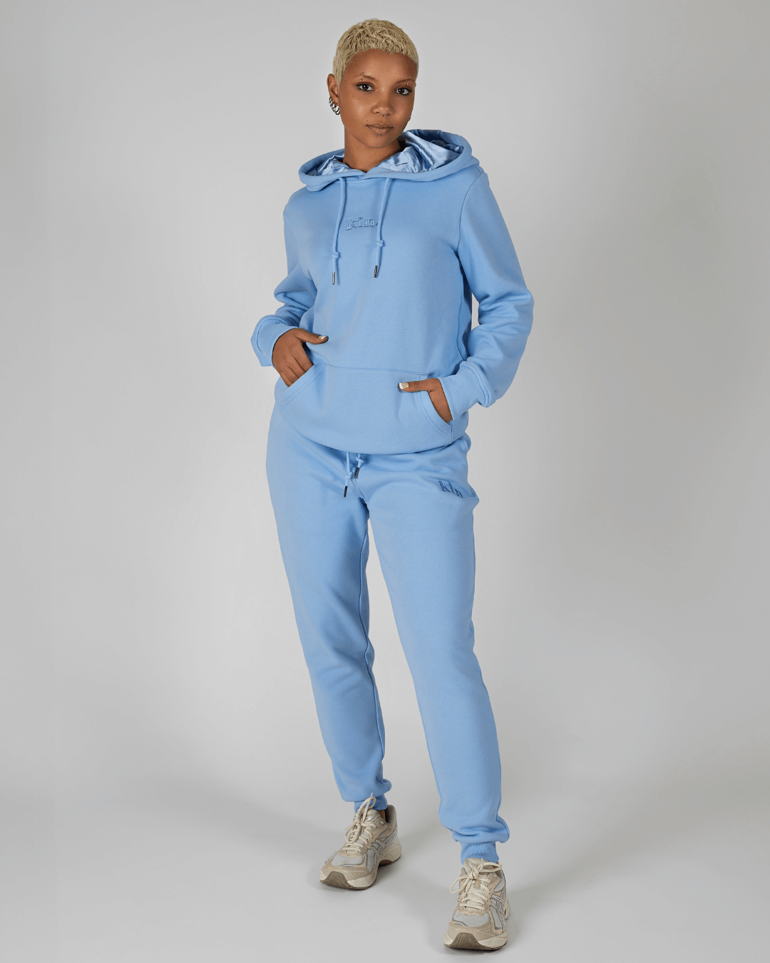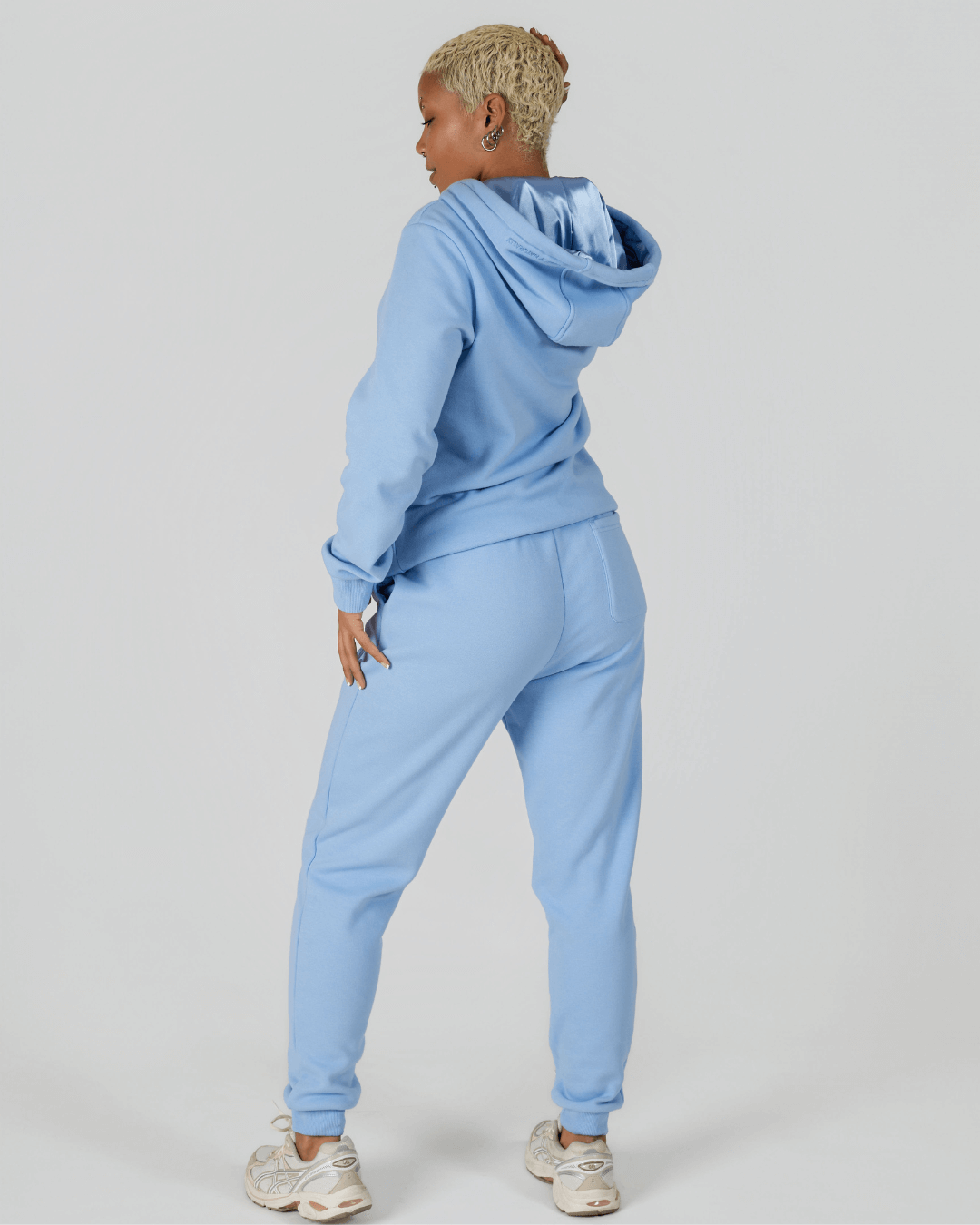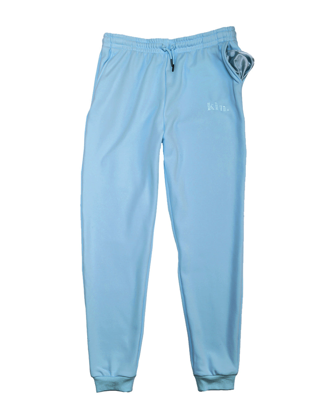 - THICK baby blue joggers, pockets lined with baby blue satin