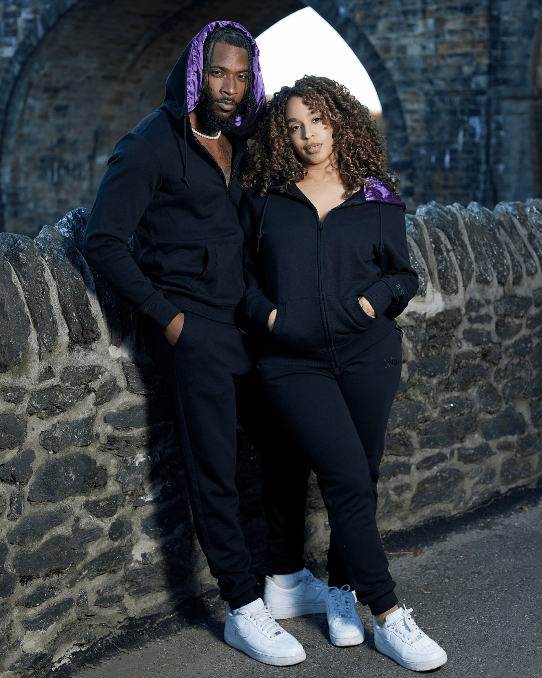 Hoodie DetailsLightweight zip up hoodieMade with 100% Cotton French TerryHoodie color is black, satin color is purpleHood is double-layered with high-grade satinKIN logo is embroidered on left sleeveOur motto "Keep It Naturally" is embroidered on edge of hood. Unisex and fitted Jogger DetailsLightweight black joggersMade with 100% Cotton French TerryFront pockets are satin lined with black satinKIN logo is embroidered below the left pocketIncludes back pocketUnisex and fitted