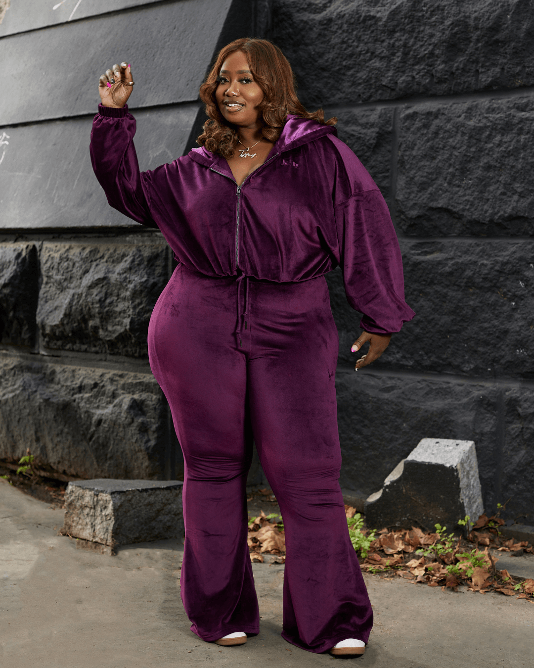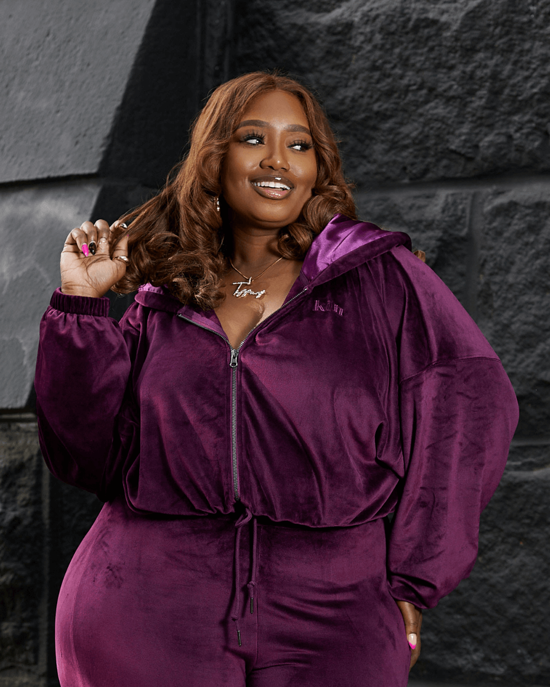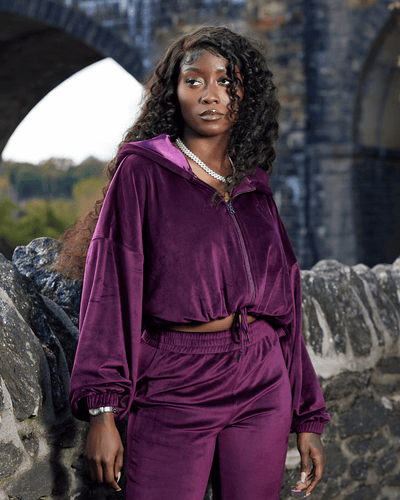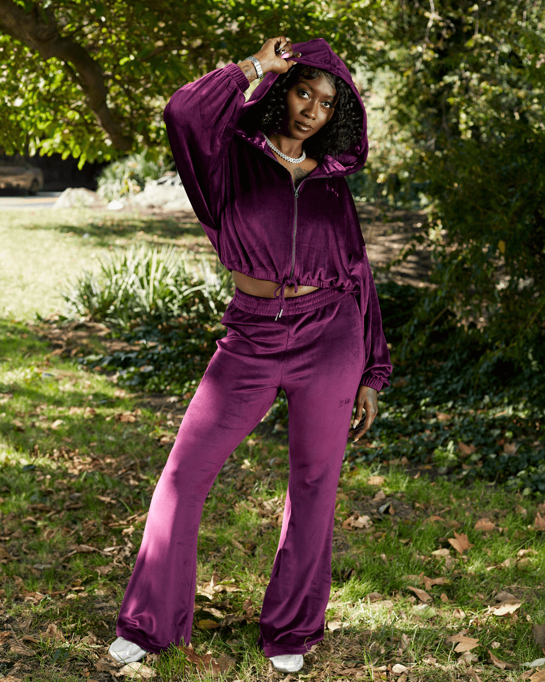 Cropped zip-up hoodie with an adjustable drawstring hem, cinch it in for a fitted look or let it flare for effortless comfort.Balloon sleeves with drop-shoulder design for a relaxed, feminine silhouette.Signature satin-lined hood to protect your hair from frizz and friction.Soft, plush velour with a subtle sheen that catches the light just right.Embroidered KIN logo on the left chest for a premium finish.Our “Keep It Naturally” motto subtly embroidered along the hood edge.Sculpted feminine, true-to-size fit that hugs in all the right places. Mid-weight velvet fabric