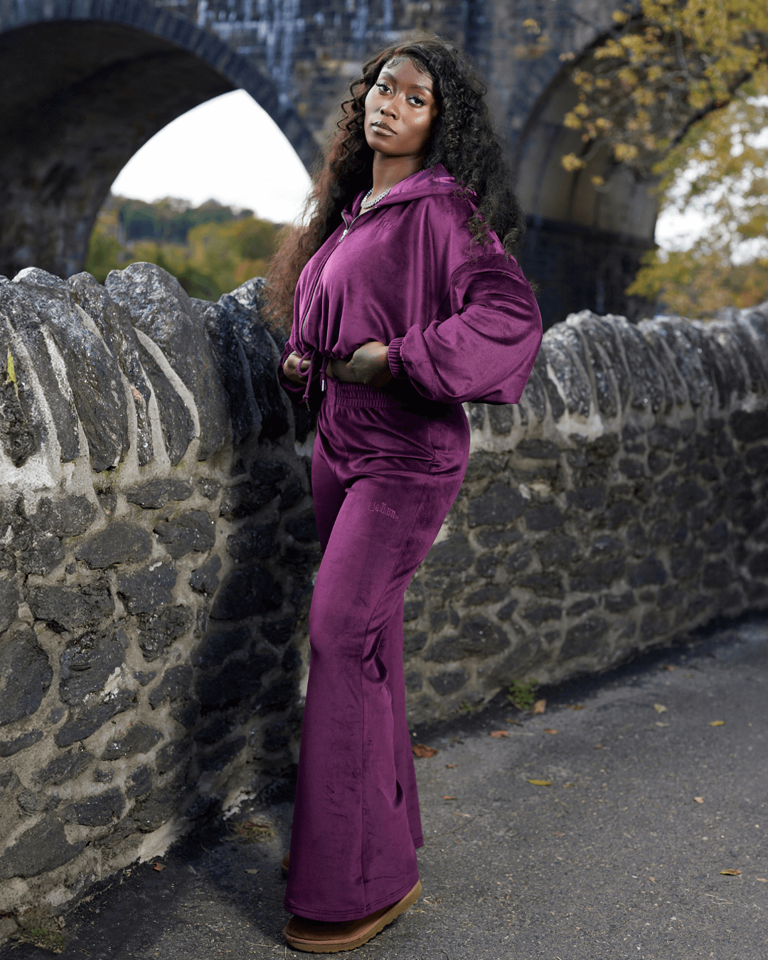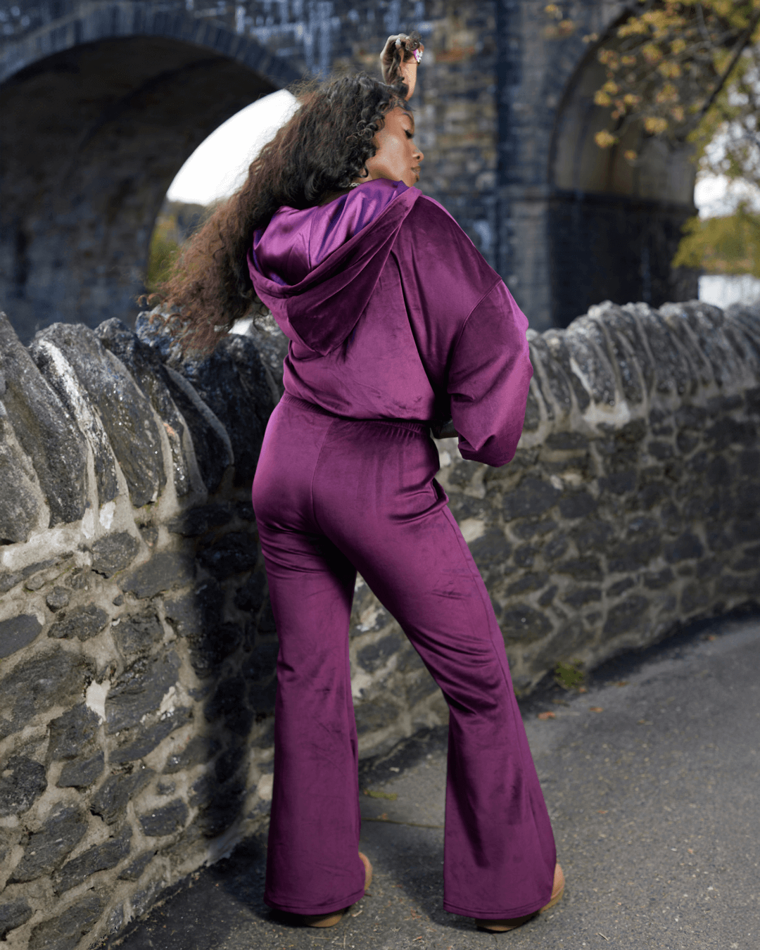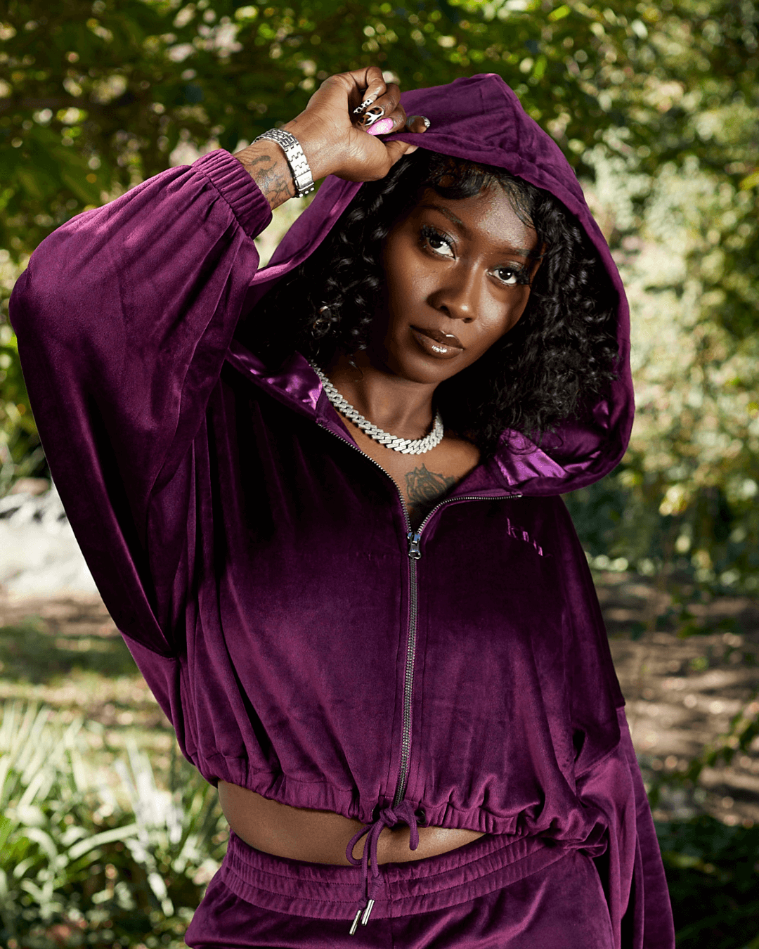 Cropped zip-up hoodie with an adjustable drawstring hem, cinch it in for a fitted look or let it flare for effortless comfort.Balloon sleeves with drop-shoulder design for a relaxed, feminine silhouette.Signature satin-lined hood to protect your hair from frizz and friction.Soft, plush velour with a subtle sheen that catches the light just right.Embroidered KIN logo on the left chest for a premium finish.Our “Keep It Naturally” motto subtly embroidered along the hood edge.Sculpted feminine, true-to-size fit that hugs in all the right places. Mid-weight velvet fabric