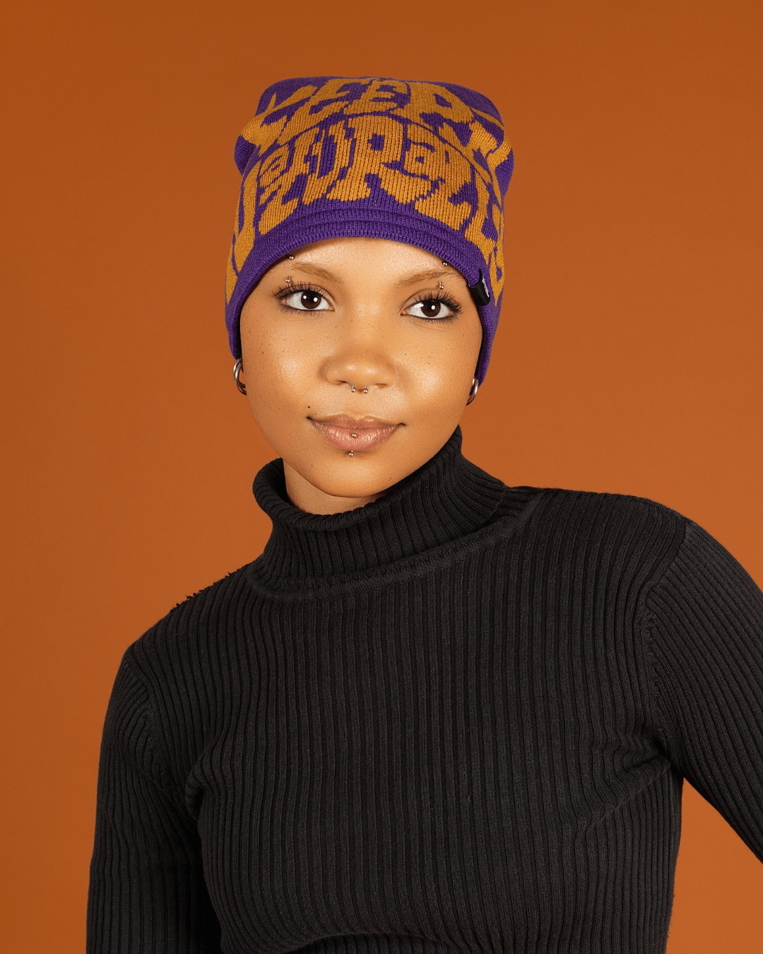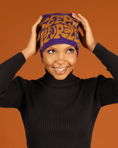 - Beanie is purple and gold print