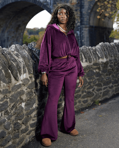 High-waisted, form-fitting pants that elongate your legs and accentuate your curves.No pockets for a sleek, streamlined finish.Stretch velour fabric for a snug yet flexible fit, sexy, sculpting, and true to size.Perfect for pairing with sneakers, heels, or cozy slides.Embroidered KIN logo on the left leg Mid-weight velvet fabric