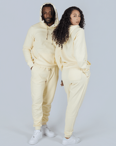 - THICK butter yellow joggers, pockets lined with beige satin