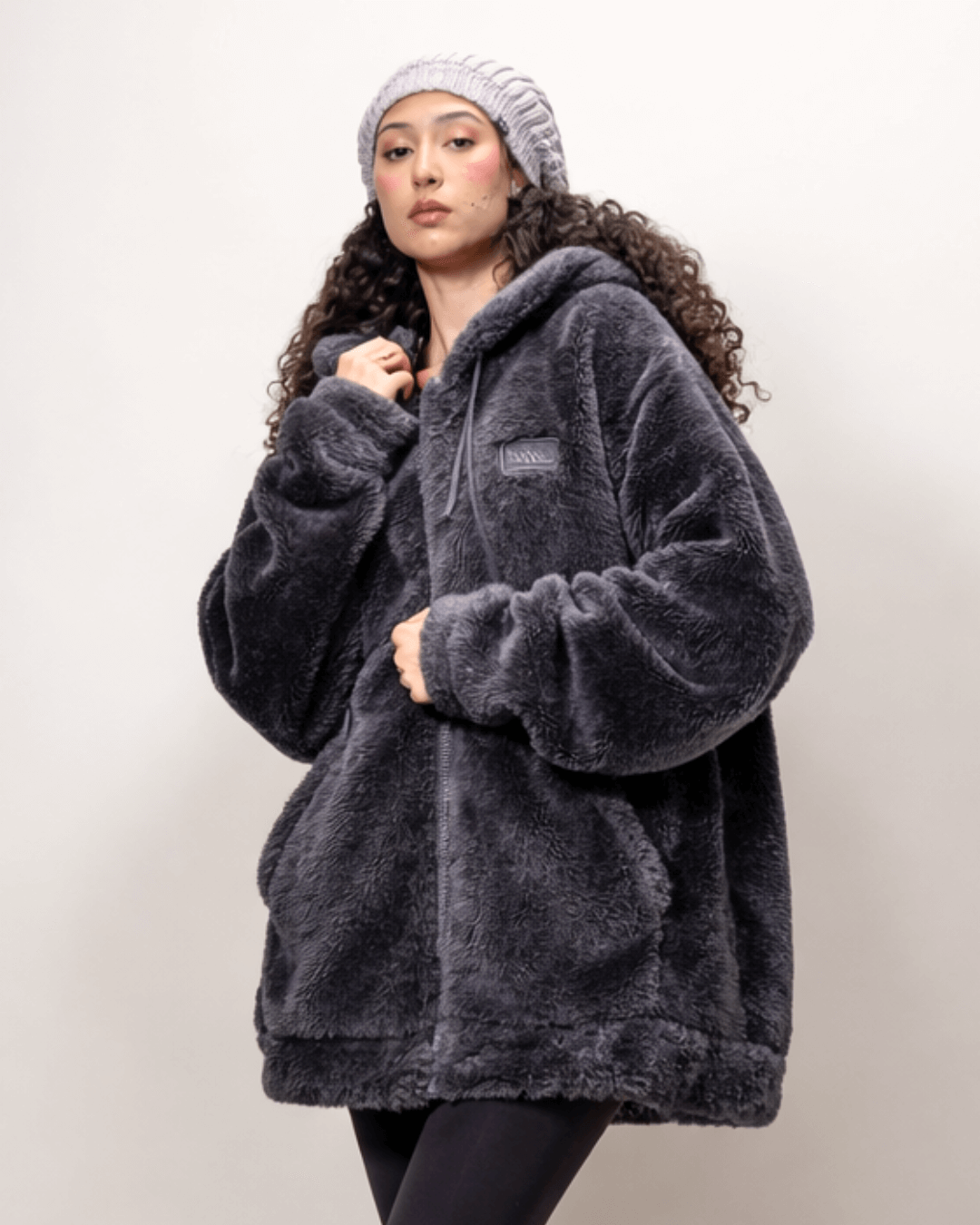 Wrap yourself in warmth. This ultra-soft, plush zip-up feels like a cozy teddy bear hug, perfect for chilly days. Its thick fleece offers high insulation, making it an ideal choice for lounging or stepping out in style. The oversized satin-lined hood protects your hair from frizz and friction while keeping you snug and stylish.