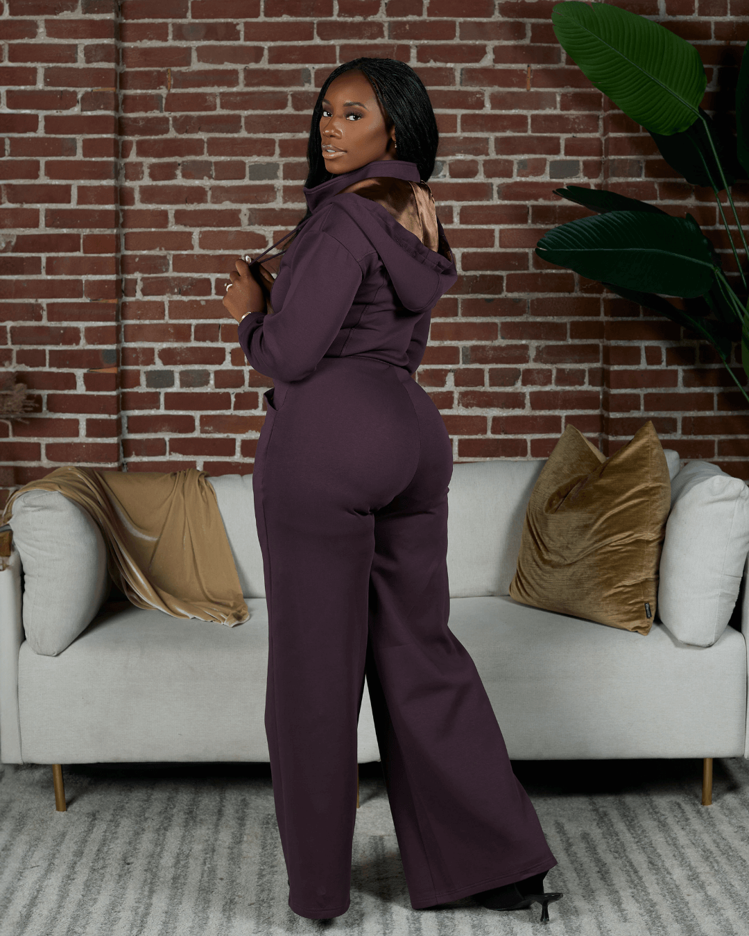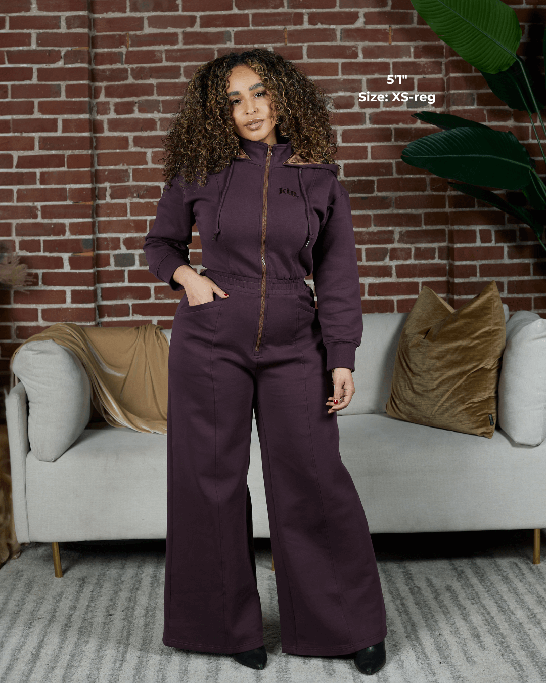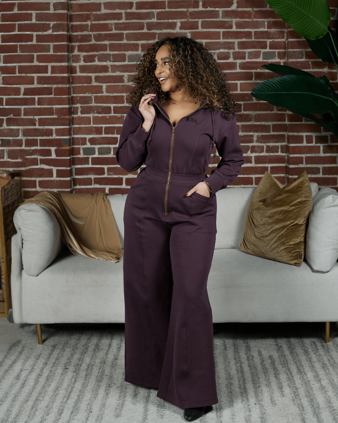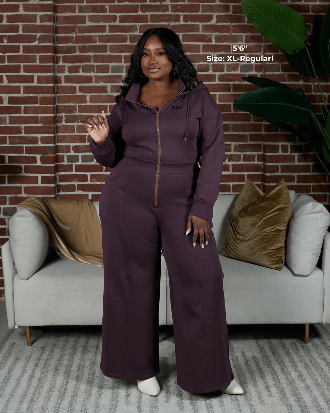 • Long sleeve, wide-leg, full-length jumpsuit with zip front closure