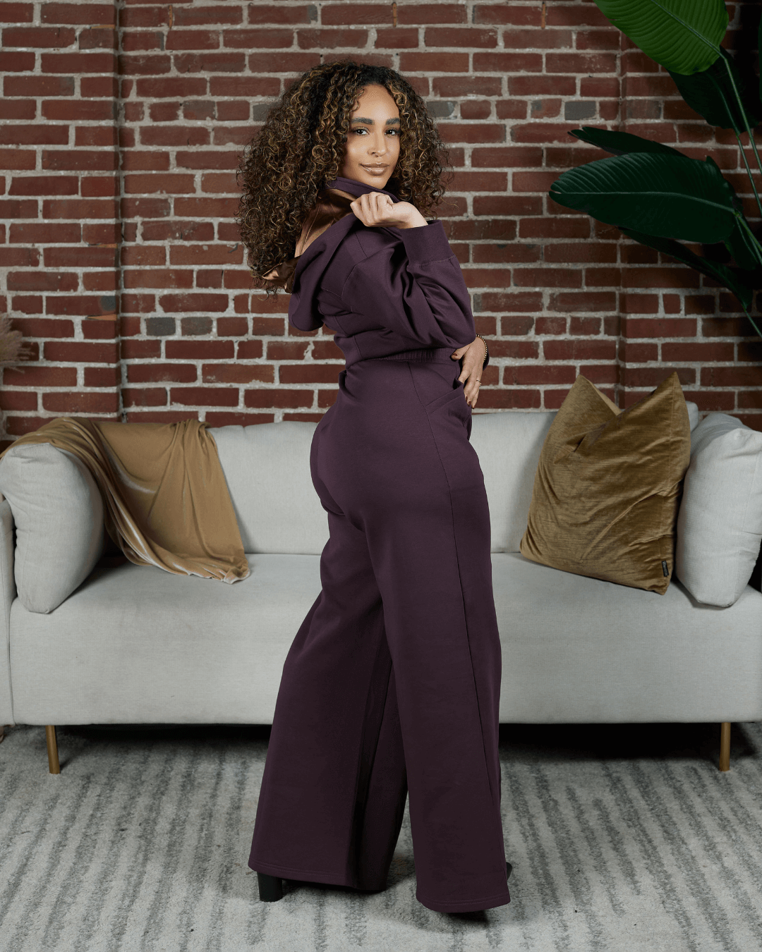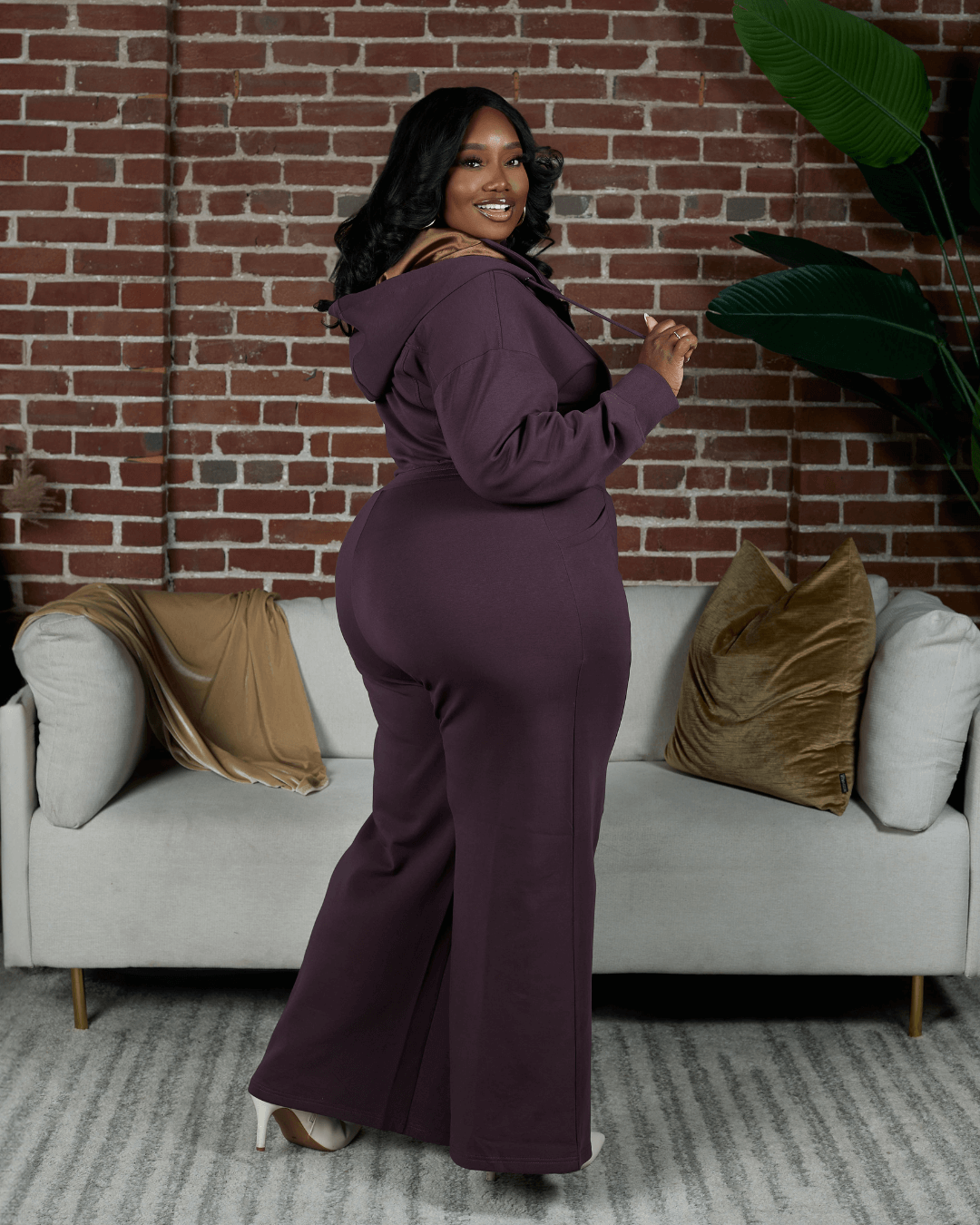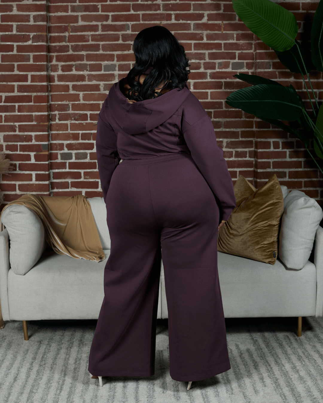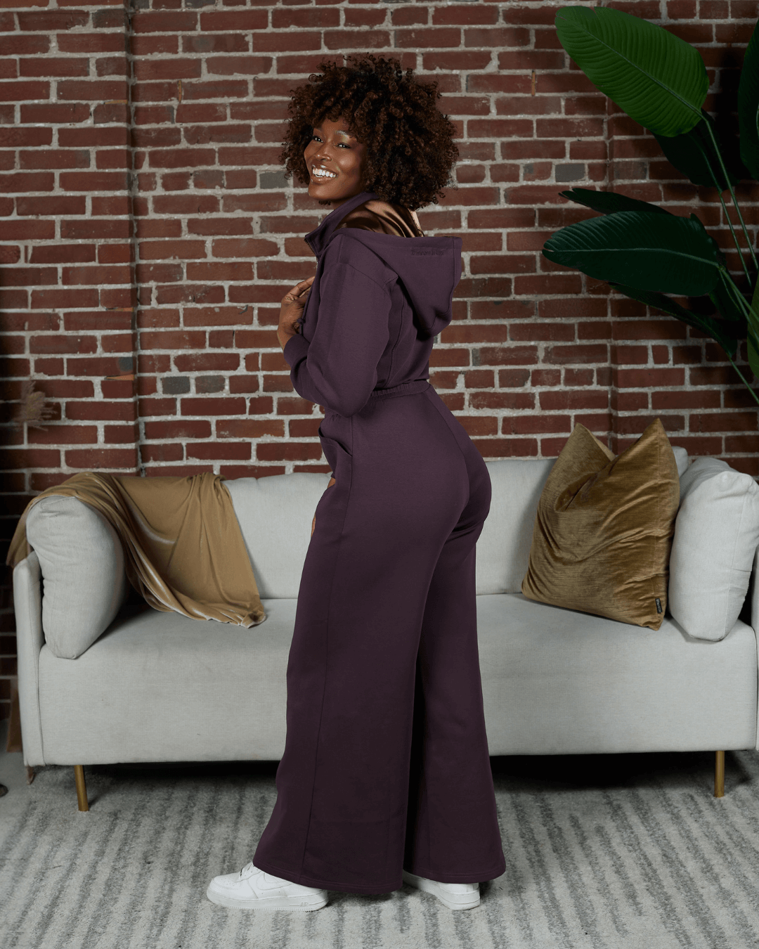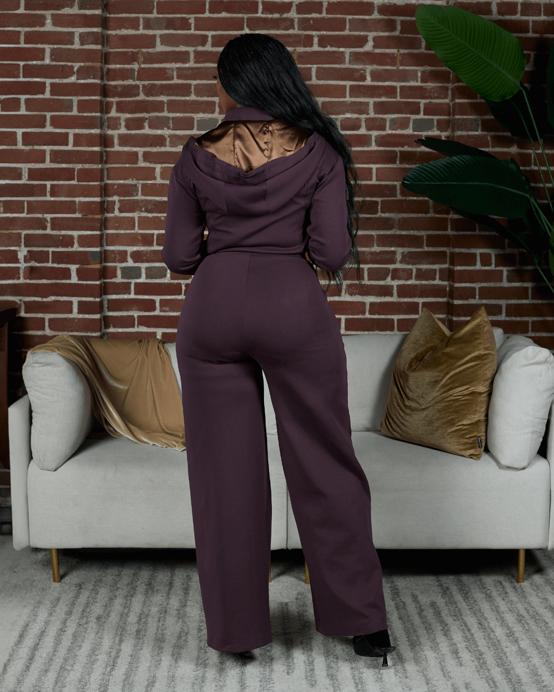 • Long sleeve, wide-leg, full-length jumpsuit with zip front closure