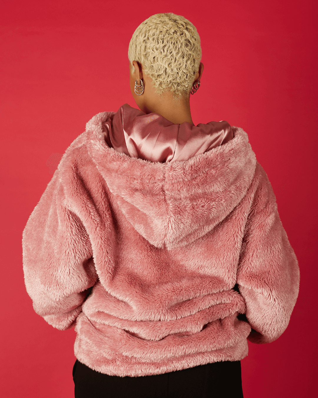 Wrap yourself in warmth. This ultra-soft, plush zip-up feels like a cozy teddy bear hug — perfect for chilly days. Its thick fleece offers high insulation, making it an ideal choice for lounging or stepping out in style. The oversized satin-lined hood protects your hair from frizz and friction while keeping you snug and stylish.