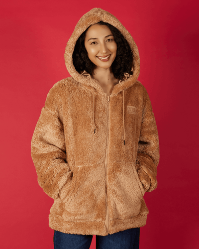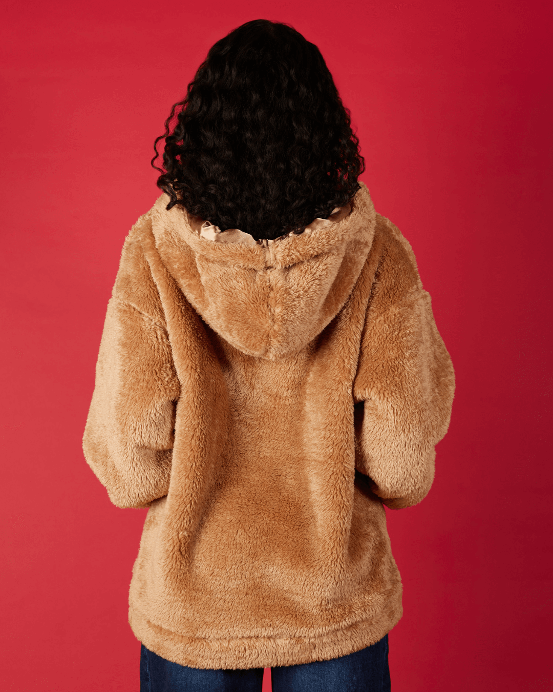 Wrap yourself in warmth. This ultra-soft, plush zip-up feels like a cozy teddy bear hug, perfect for chilly days. Its thick fleece offers high insulation, making it an ideal choice for lounging or stepping out in style. The oversized satin-lined hood protects your hair from frizz and friction while keeping you snug and stylish.
