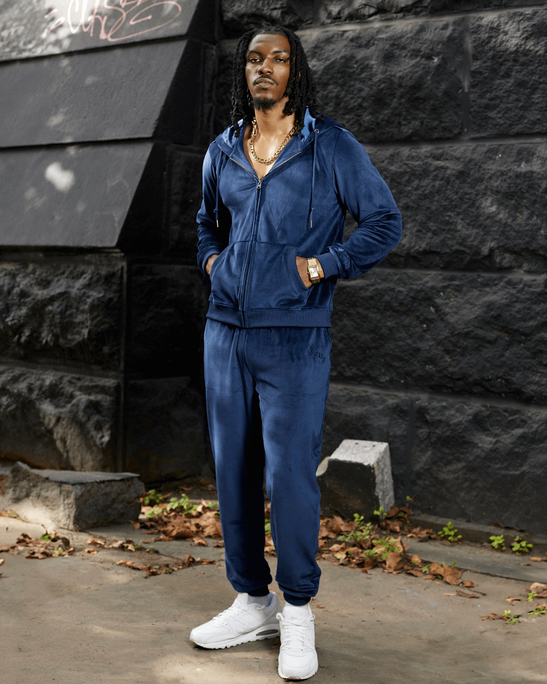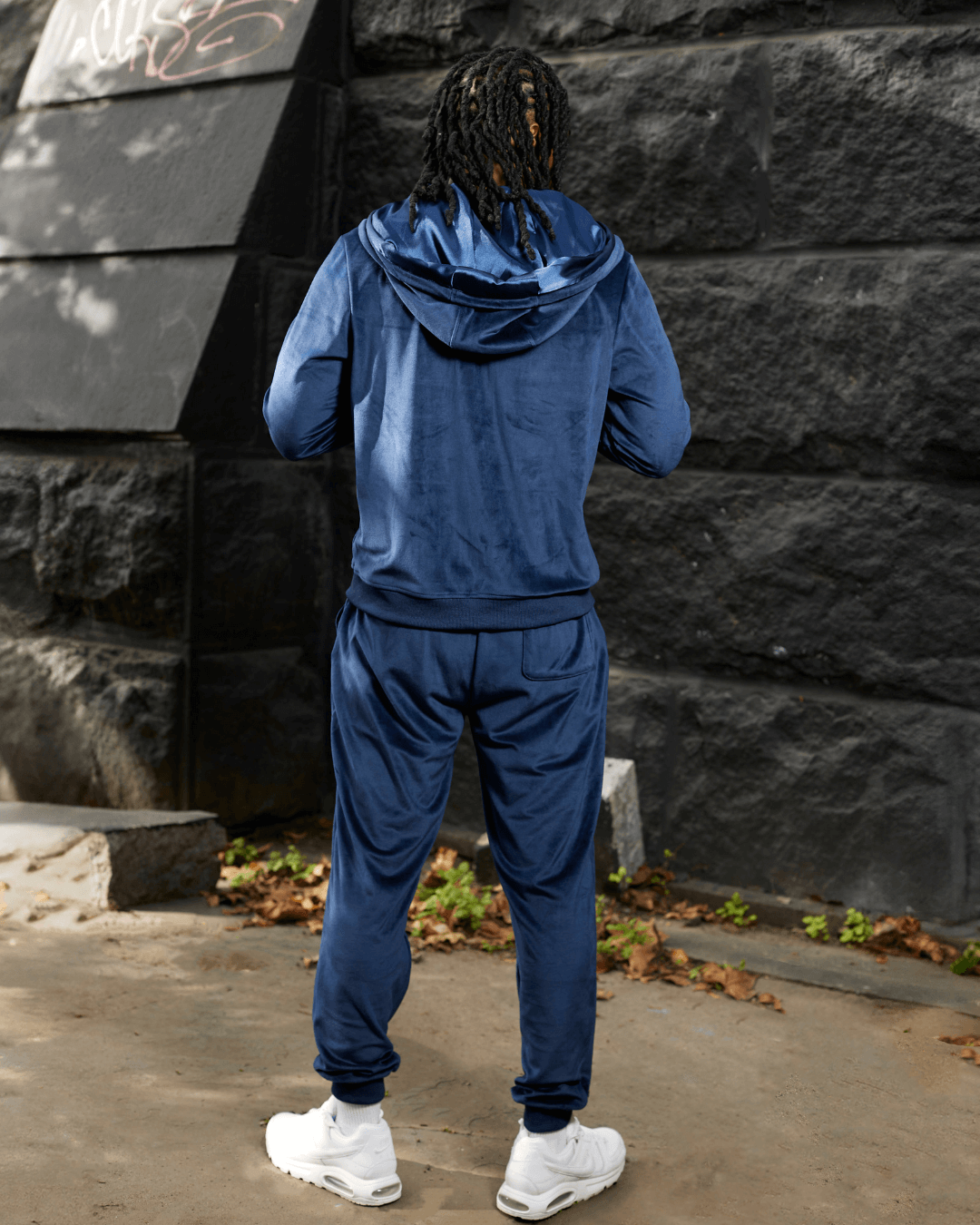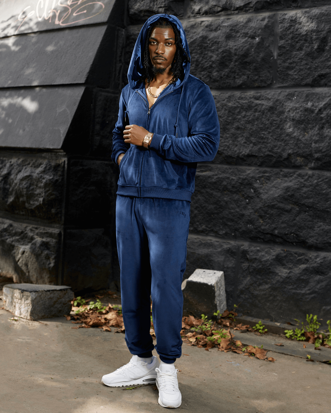 Hoodie Details:Full-zip hoodie crafted from ultra-soft velour for that classic tracksuit feel.Signature satin-lined hood for protection, comfort, and shine.Relaxed, unisex fit with just the right amount of drape.Front pockets for on-the-go ease.Ebroidered KIN logo on the left chest for a premium finish.Our “Keep It Naturally” motto subtly embroidered along the hood edgeMid-weight velvet fabric Jogger Details:Coordinating jogger-style pants with satin-lined pockets for a smooth, premium touch.Elastic waistband and cuffed hems for a secure, tailored feel.Designed for versatility, lounge in it, layer it, live in it.Features an embroidered KIN logo on the left leg.Includes a functional back pocket for added convenience.Adjustable drawstring waistband for a customizable fit.