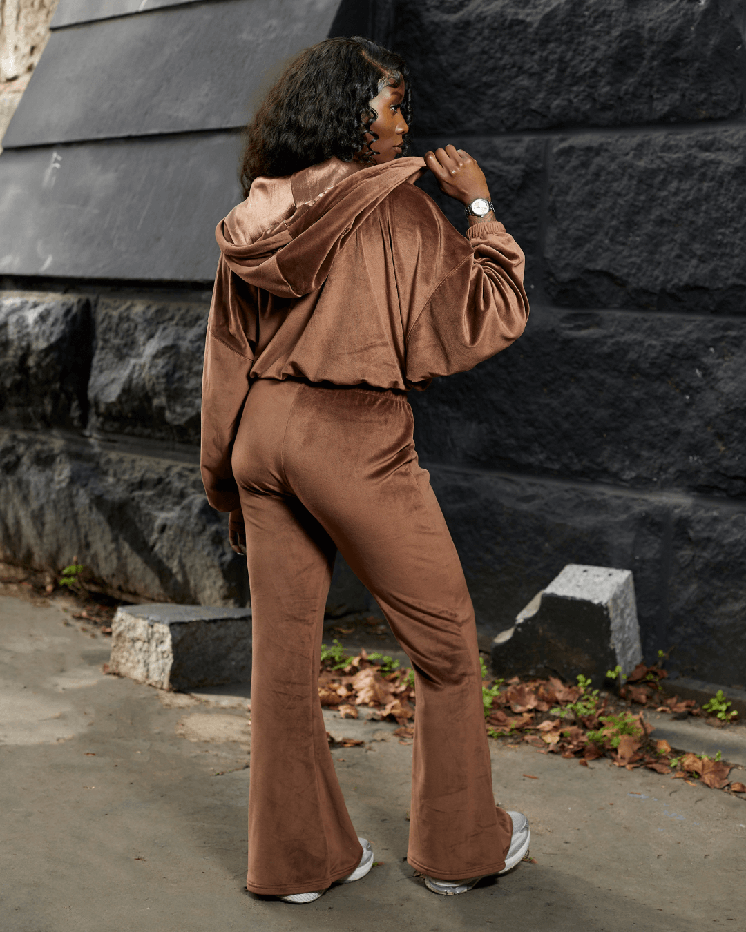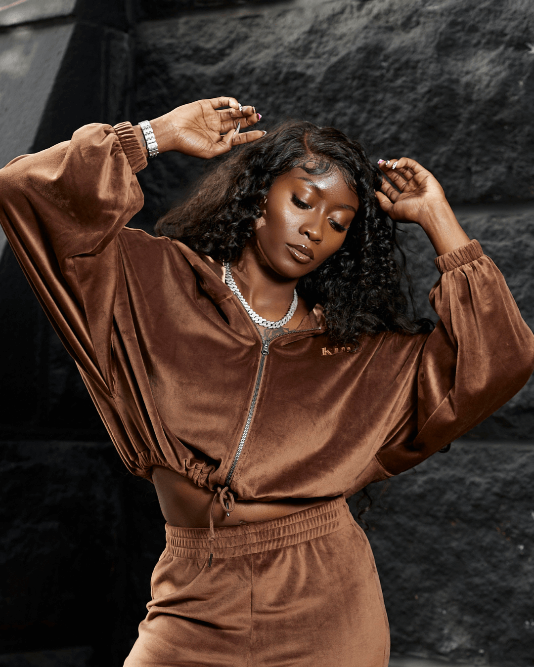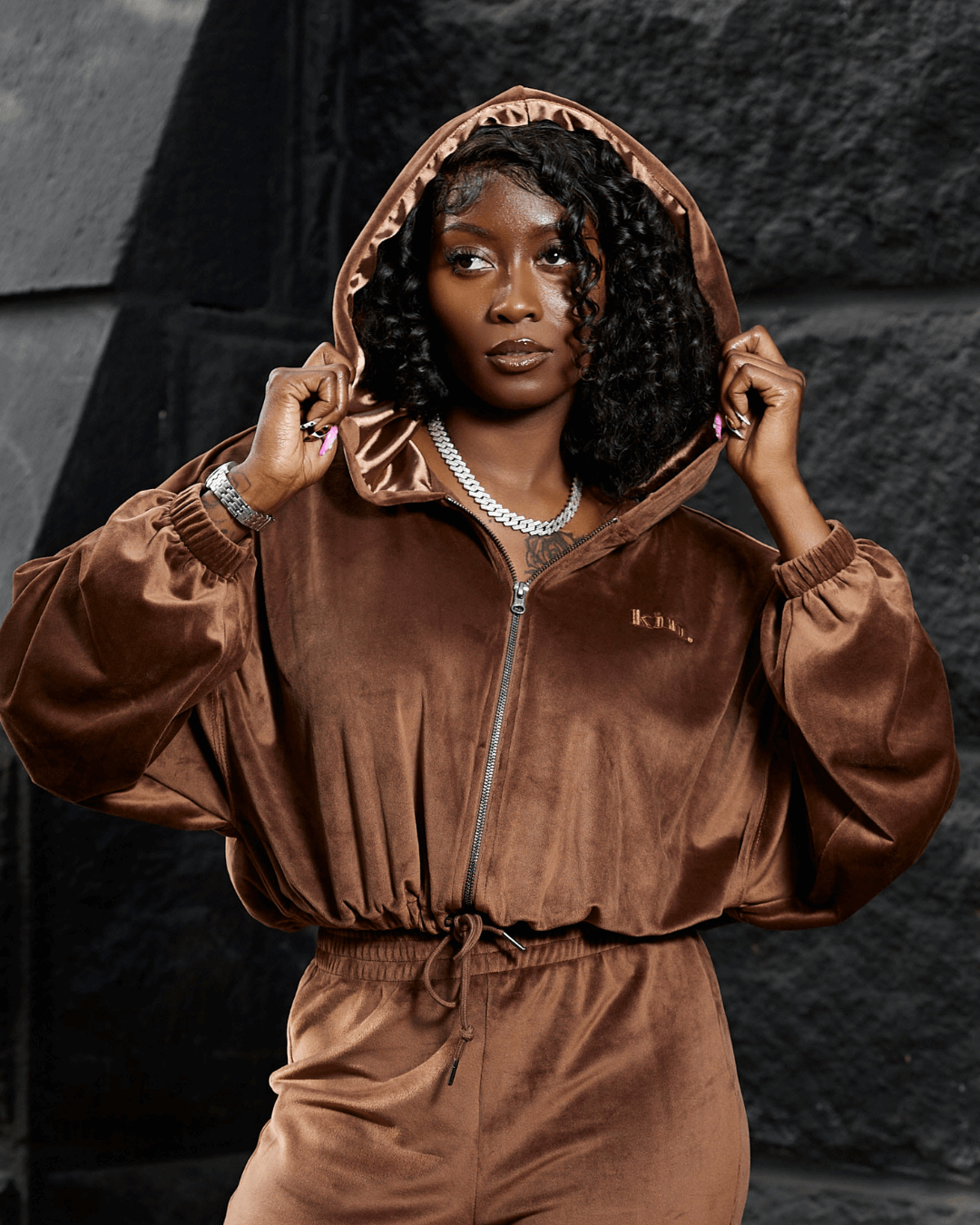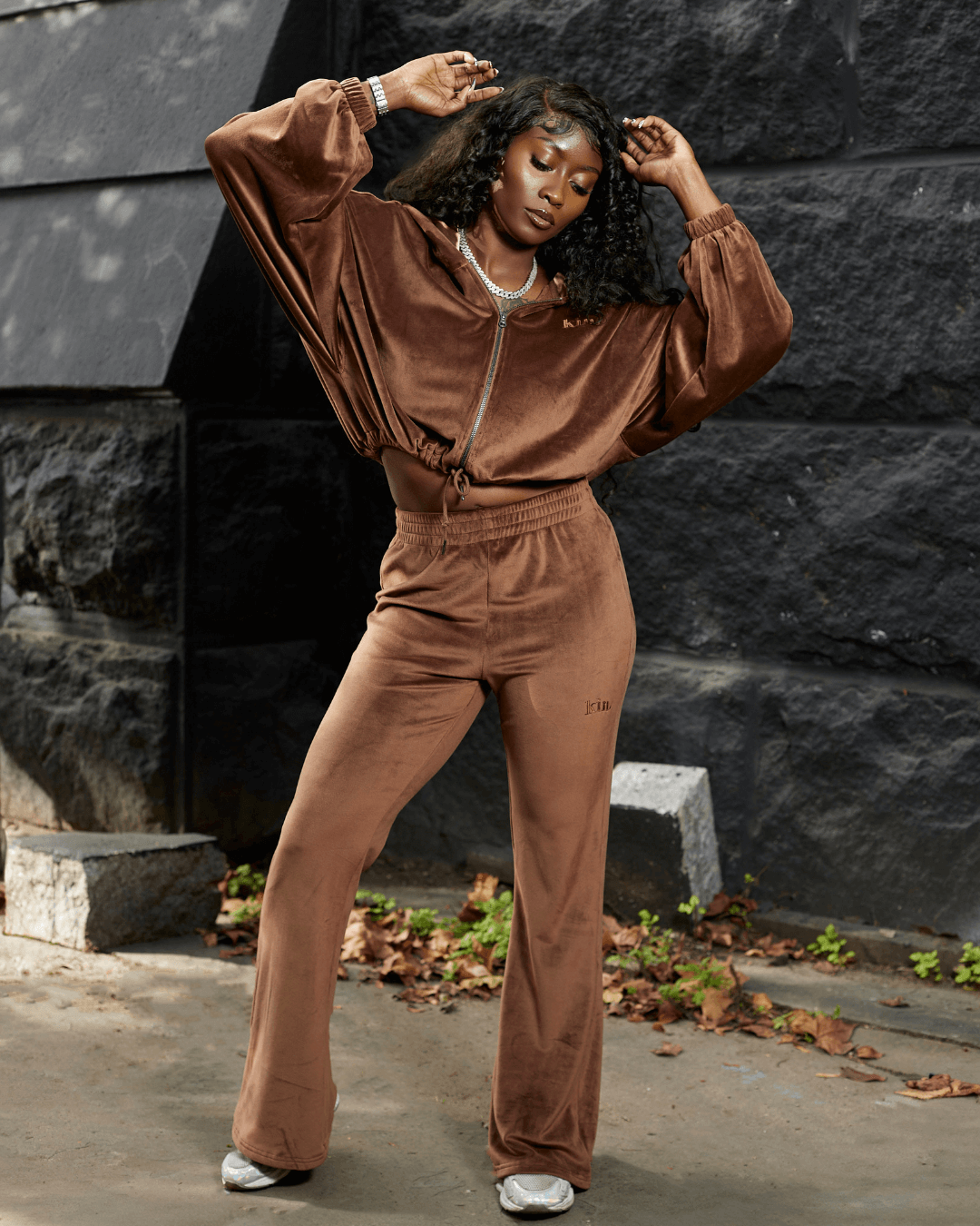 Hoodie Details: Cropped zip-up hoodie with an adjustable drawstring hem, cinch it in for a fitted look or let it flare for effortless comfort.Balloon sleeves with drop-shoulder design for a relaxed, feminine silhouette.Signature satin-lined hood to protect your hair from frizz and friction.Soft, plush velour with a subtle sheen that catches the light just right.Embroidered KIN logo on the left chest for a premium finish.Our “Keep It Naturally” motto subtly embroidered along the hood edge.Sculpted feminine, true-to-size fit that hugs in all the right places. Mid-weight velvet fabricPants Details:High-waisted, form-fitting flare pants that elongate your legs and accentuate your curves.No pockets for a sleek, streamlined finish.Stretch velour fabric for a snug yet flexible fit, sexy, sculpting, and true to size.Perfect for pairing with sneakers, heels, or cozy slides.Embroidered KIN logo on the left leg